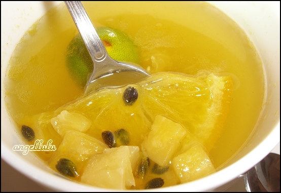 裡頭有金桔、柳橙、鳳梨丁,一看就是很熱情的鮮果茶,